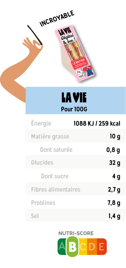 Le british c’est du bacon végétal La Vie™ riche en protéines et sans OGM. une sauce mayo végétale onctueuse, de la salade et des tomates pour une touche de fraîcheur, le tout dans un pain de mie aux céréales ultra gourmand en forme triangulaire