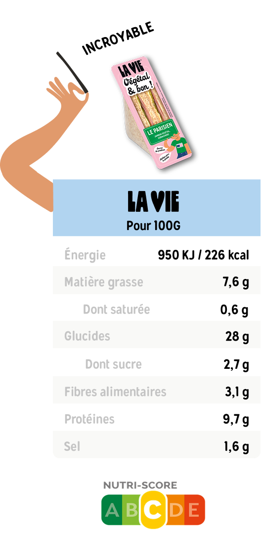 Le parisien c’est du jambon végétal La Vie™️ à base de protéines de pois et de soja certifié 100% love et sans OGM, des cornichons pour le croquant et une bonne dose de mayo.