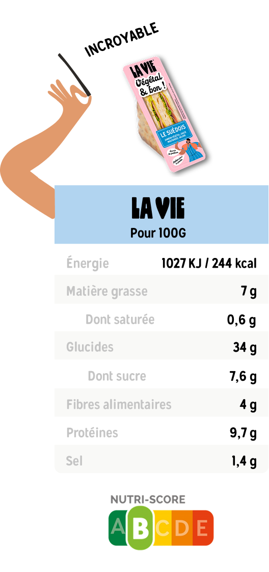 Le suédois c’est du jambon végétal La Vie™️ à base de protéines de pois et de soja certifié 100% love et sans OGM, de la salade pour une touche de fraîcheur et une sauce moutardée pour relever le tout dans deux belles tranches de pain ultra gourmand en forme triangulaire.